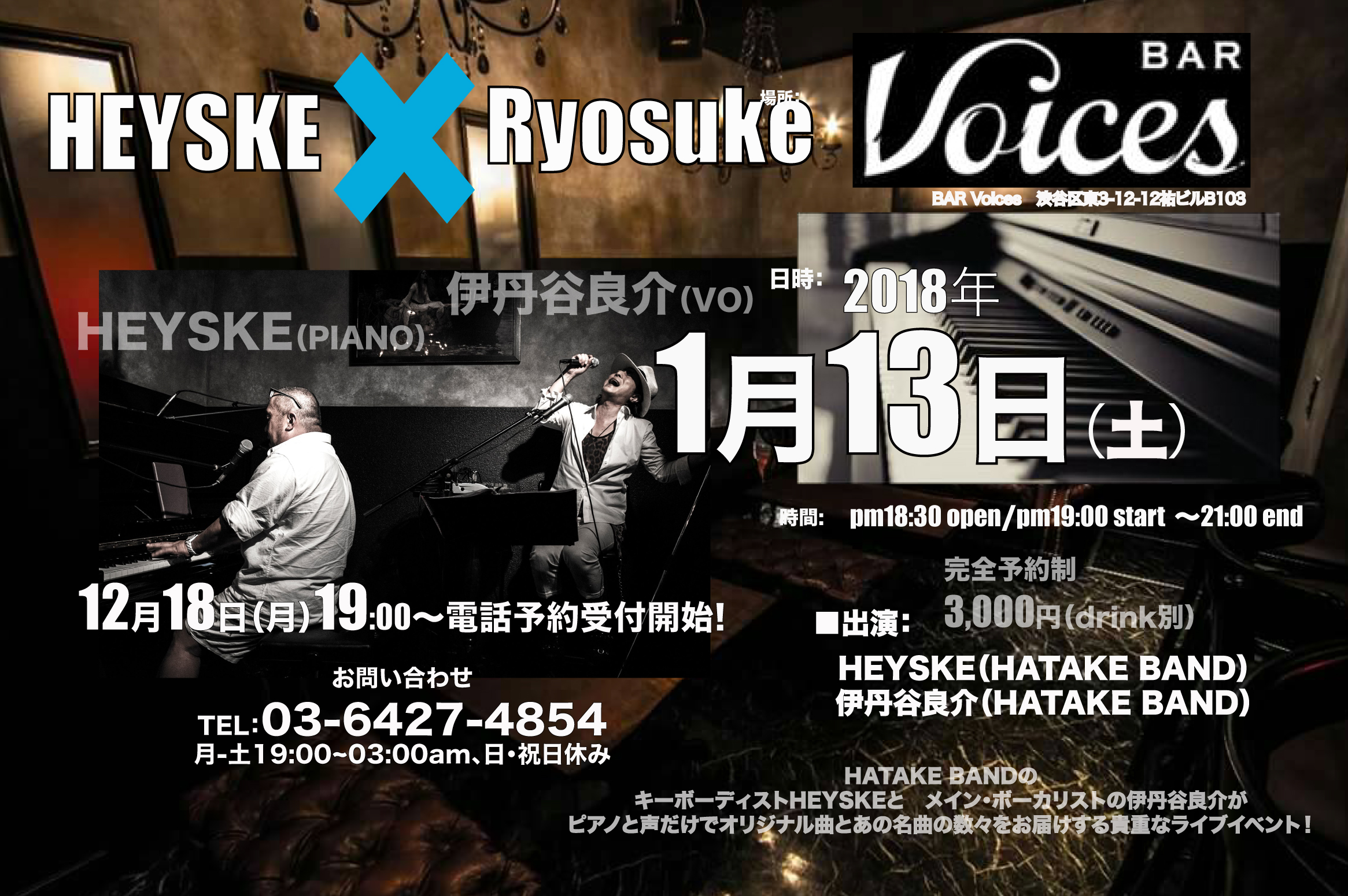 BAR Voicesのアップライト・ピアノ入荷記念イベント、好評につき、 HATAKE BANDのキーボーディストHEYSKEとメインボーカリストの伊丹谷良介がピアノと声だけであの名曲の数々をお届けする貴重なライブ・イベント!