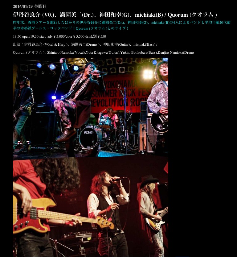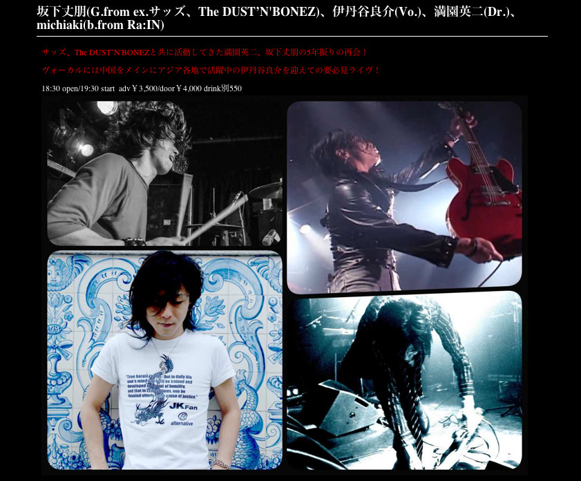 出 演 : 坂下丈朋(G.from ex.サッズ、The DUST’N'BONEZ)、伊丹谷良介(Vo.)、満園英二(Dr.)、michiaki(b.from Ra:IN)
