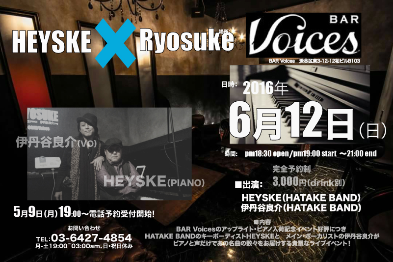 BAR Voicesのアップライト・ピアノ入荷記念イベント、好評につき、 HATAKE BANDのキーボーディストHEYSKEとメインボーカリストの伊丹谷良介がピアノと声だけであの名曲の数々をお届けする貴重なライブ・イベント!